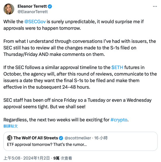 不過根據 Fox Business 記者 Eleanor Terrett 今晨卻在 X 平台逆風而行,表示她不認為比特幣現貨 ETF 真的能夠在這兩天獲得批准。因為就她與 ETF 發行人溝通後了解到的資訊,SEC 仍需要在週四/週五收到被提交的 S-1 文件後,還需要對各家發行商所做的更改一一進行審查並對其提出評論,但事實上 SEC 的工作人員自上週五起已開始休假了。