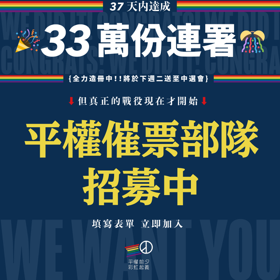 為綁定年底選舉,並力拼公投成案,婚姻平權公投小組在歷時 37 天的衝刺努力後,終於在昨日晚間宣布收到 33 萬份連署書,在短期內即以驚人速度達到連署目標,並預計於下週將所有連署書送至中選會。