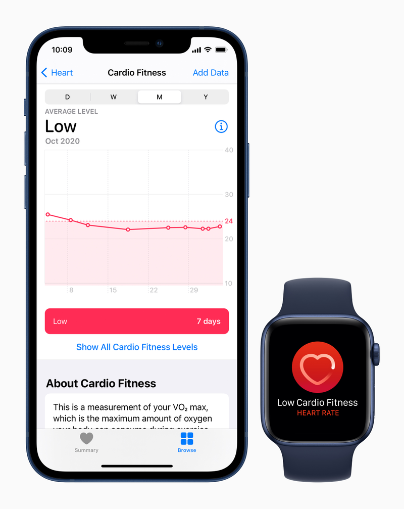 透過Apple Watch中,包括光學心率感測器、GPS和加速度計等多個感測器,再加上watchOS 7系統,可以為Apple Watch使用者在全天行走時進行心適能測量,並估算出較低的心適能水平。而透過iPhone上的「健康」App,讓使用者可以更加直覺地去查看自己的心適能分類,是屬於高、高於平均、低於平均或低等分級,也可以查詢長期的心適能水平變化。