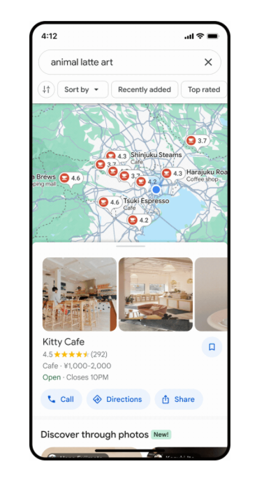 Google地圖預告將提供更多元的搜尋方式,例如搜尋特定內容「可愛動物藝術拿鐵」的最佳地點時,將獲得所需內容的照片優先結果,而這些結果都是基於對Google地圖社群共享的數十億張照片的分析,所有的結果都是透過人工智慧和圖像辨識模型完成的。