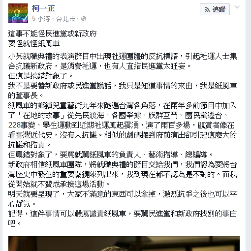 對於明天的就職典禮他則說:「而我從開始就不贊成承接這場活動。明天就要呈現了,大家不滿意的東西可以拿掉,激烈抗爭之後也可以平心靜氣。」柯一正更於臉書發文的最後表示:「不過請記得,這件事情可以嚴厲譴責紙風車,要駡民進黨和新政府找別的事由吧。」