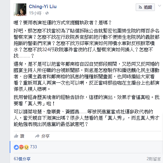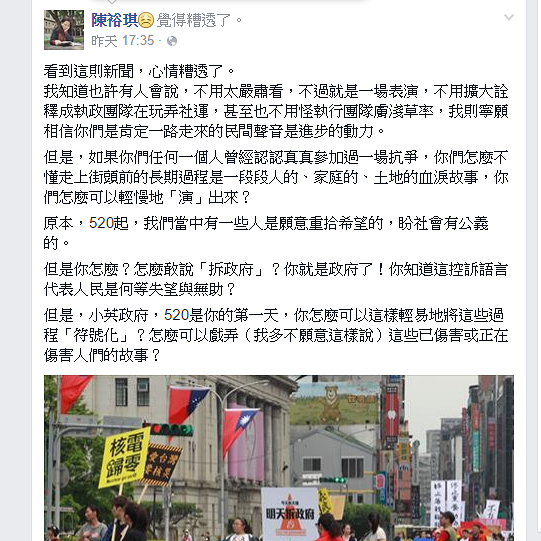 陳裕琪更沉痛的表示「原本,520起,我們當中有一些人是願意重拾希望的,盼社會有公義的。但是你怎麼?怎麼敢說『拆政府』?你就是政府了!你知道這控訴語言代表人民是何等失望與無助?但是,小英政府,520是你的第一天,你怎麼可以這樣輕易地將這些過程『符號化』?怎麼可以戲弄(我多不願意這樣說)這些已傷害或正在傷害人們的故事?」